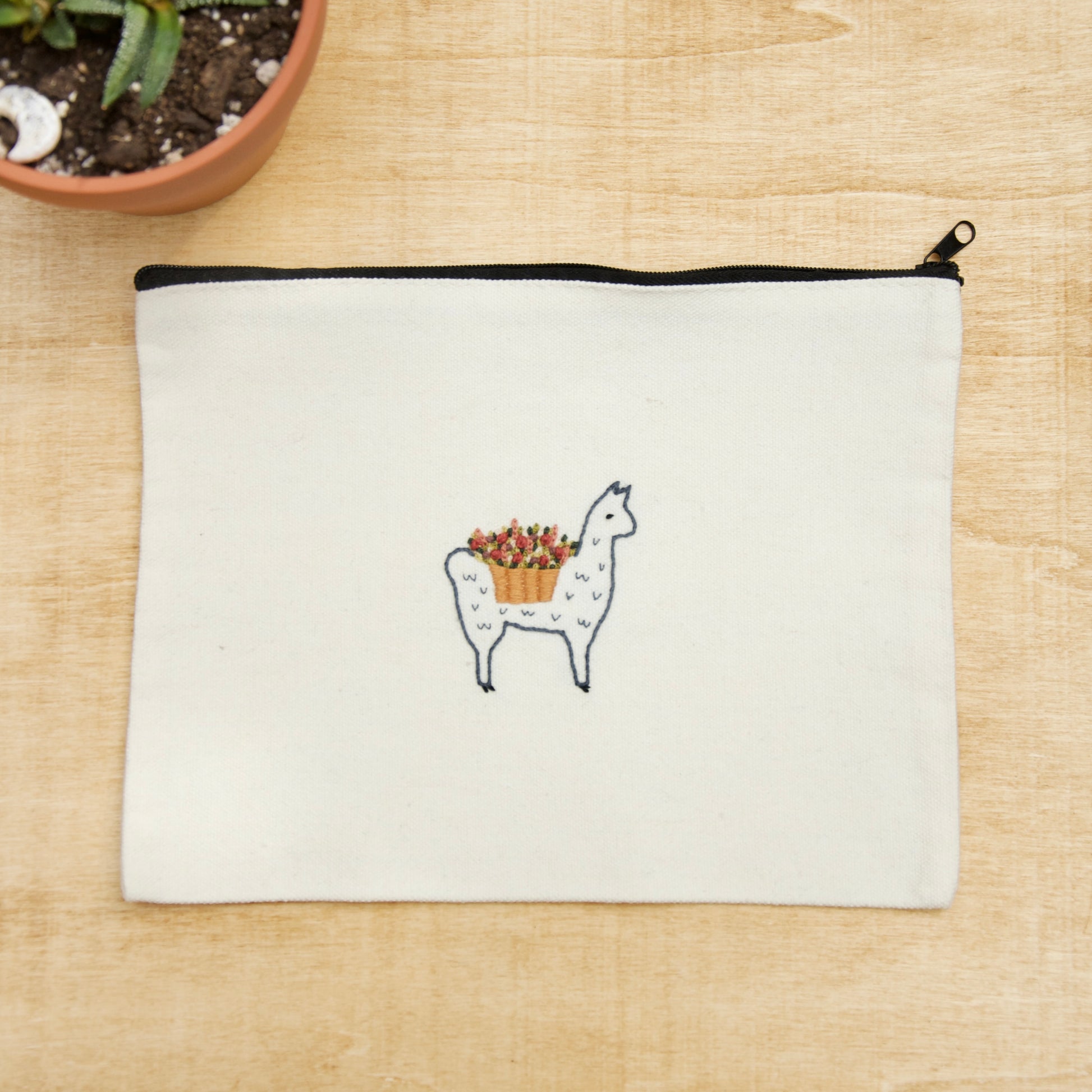 Minimal design zip pouch with an alpaca on the front, with a basket of flowers. All the alpacas and flowers are hand stitched, and as such each zip pouch will differ slightly.