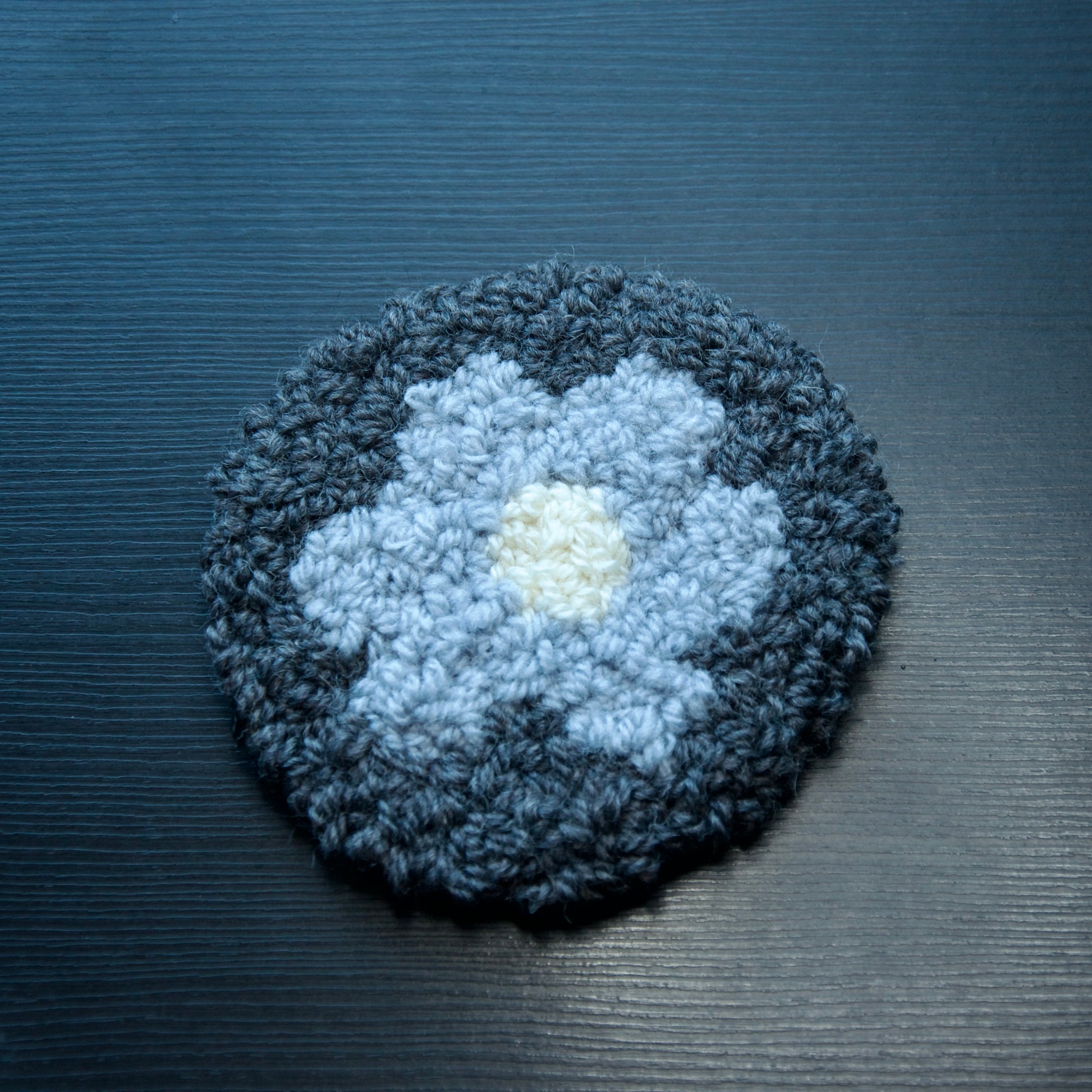 These coasters are between 4" - 5" wide. Made with a blend of fibres including alpaca, merino, acrylic, mohair, nylon, and cotton.